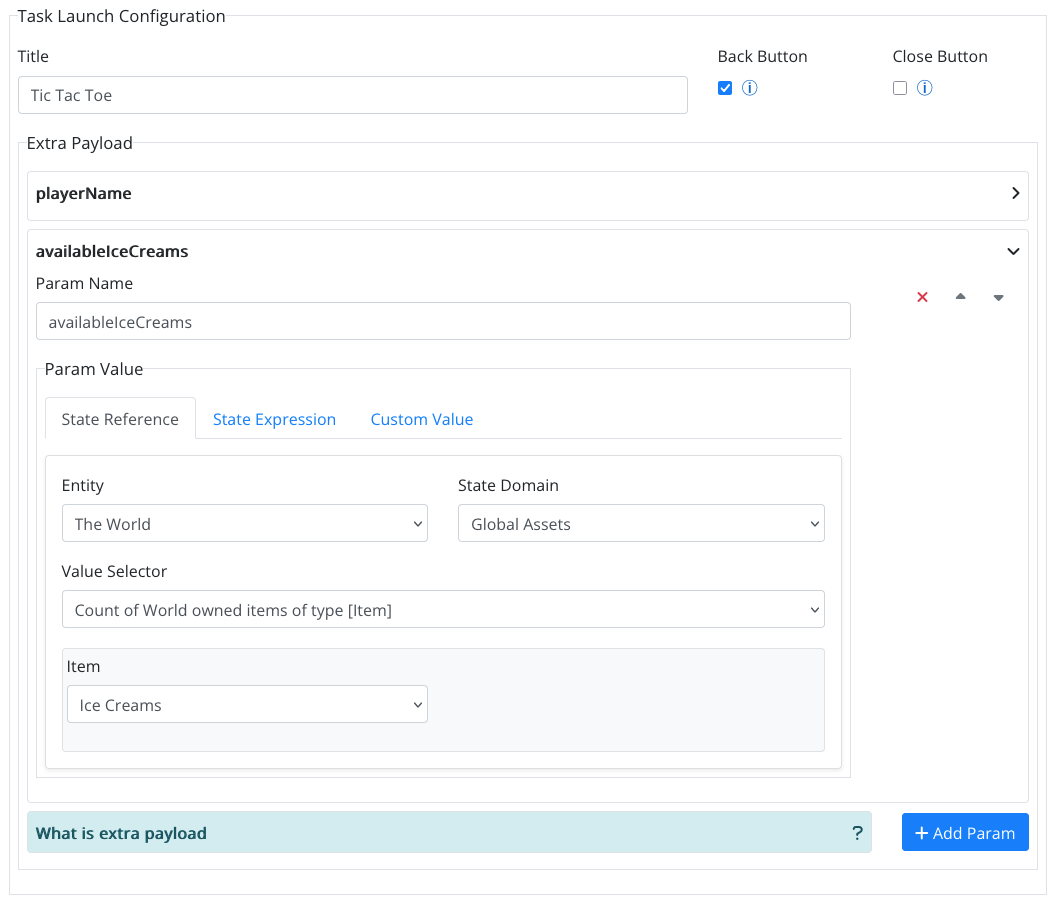 You can configure additional data to be sent as extra payload params when the task starts. Each param should have a name, and a value. Param values can be custom String values, State References (e.g., the number of owned diamonds by the player) or a State Expressions (e.g., true/false if the player has destroyed a some object of type Monster).